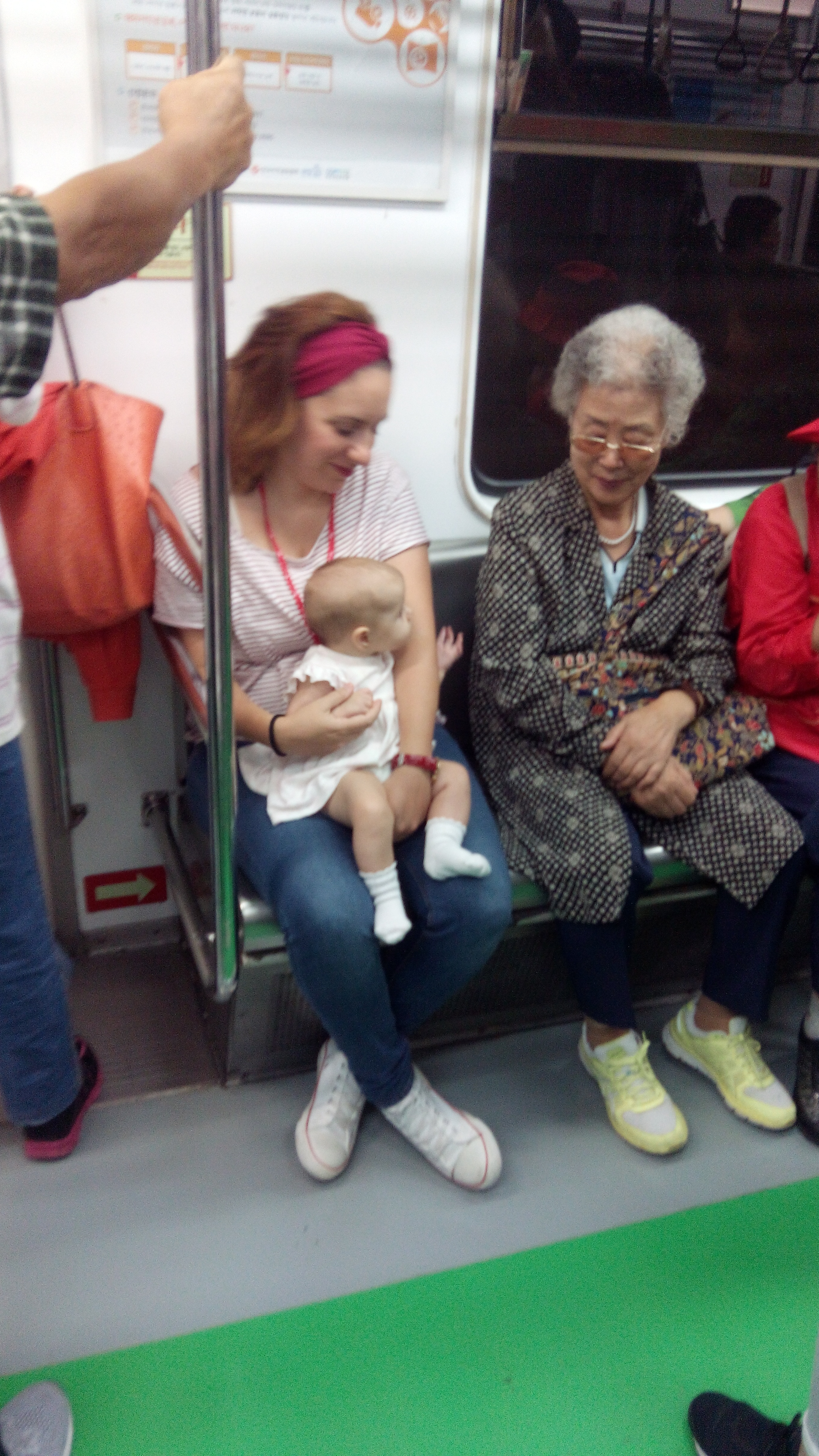 El metro iba completamente lleno, algo que, como descubrimos después, nos pasaría con frecuencia. Posiblemente, fue una de las partes menos cómodas del viaje. El trayecto duró casi dos horas y hasta que no se vació un poco, resultó complicado incluso dar el pecho a Alma. Más adelante os contaré cómo resolvimos este problema durante nuestra estancia en Seúl.